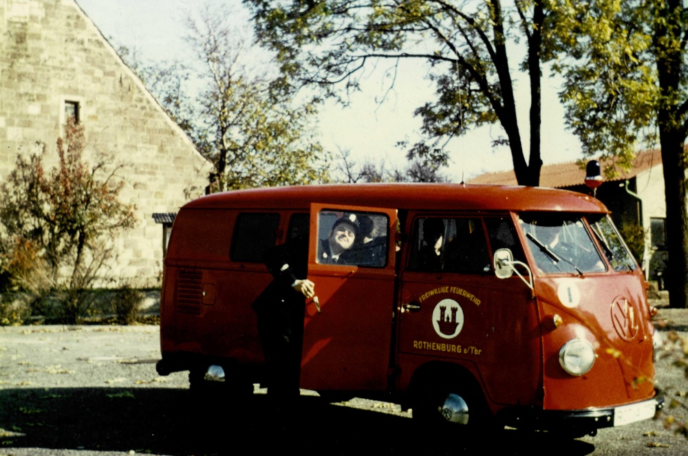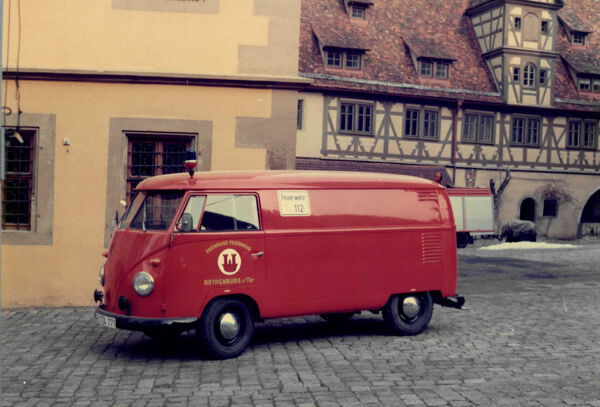 Fahrgestell Volkswagen VW Bus Typ 1. Baujahr 1958. Fahrzeug gehörte ursprünglich der Firma Bohne Hemdenfabrik Rothenburg. Es wurde 1965 von der Feuerwehr Rothenburg übernommen und durch Magirus/Ulm ein Feuerwehrtechnischer Umbau ausgeführt. Ausgemustert 1988 und an einen Privatmann aus dem Lkr. Mayen-Koblenz verkauft. Funkrufname Tauber bzw. Florian Rothenburg 5 ab Dezember 1974 Florian Rothenburg 44/1
