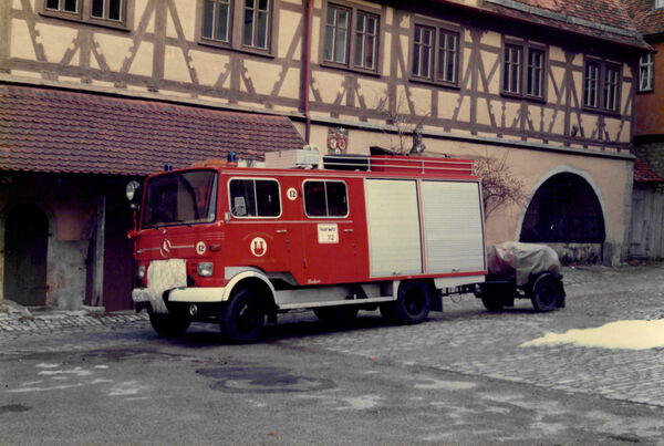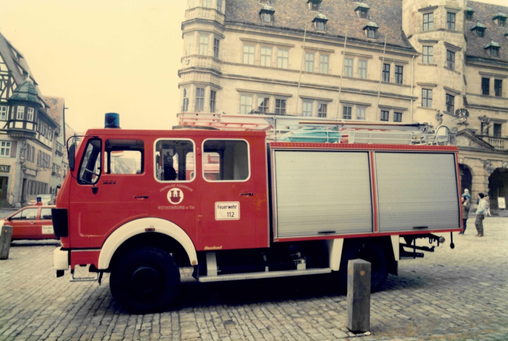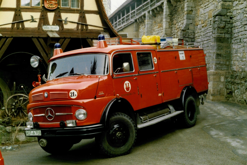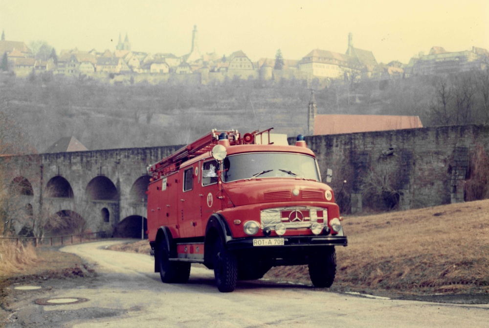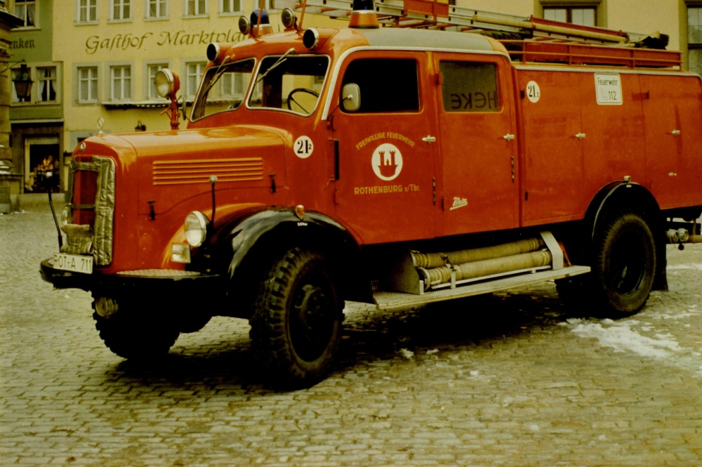Fahrgestell Daimler Benz, Aufbau Carl Metz Karlsruhe Typ Bayern; Feuerlöschkreiselpumpe mit 1500 Liter / Minute Leistung, 2500 Liter Wassertank. Fahrzeug wurde Ende der 60er Jahre mit BOS-Funk ausgestattet. Funkrufname „Tauber 3“, Änderung ab 01.07.1971 in „Florian Tauber 3“ und im August 1971 in „Florian Rothenburg 3“ ab Dezember 1974 dann „Florian Rothenburg 21/2. Fahrzeug wurde 1986 an die Daimler Benz AG verkauft. Er wurde gern "Mahagoni" genannt, da er eine Innenausstattung aus eben jenem Holz hatte.