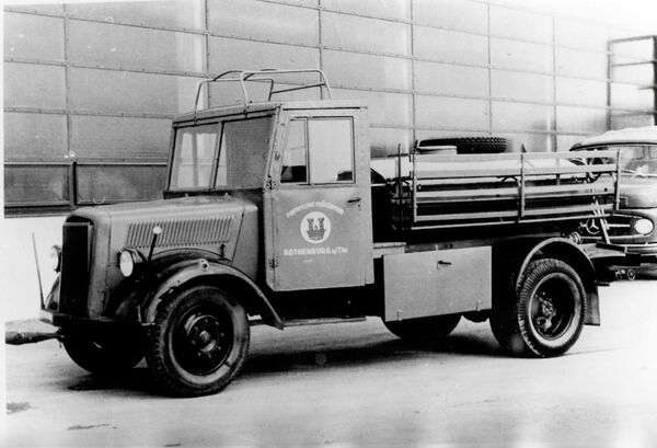 Fahrgestell Opel 3 to, Aufbau Magirus, Feuerlöschkreiselpumpe mit 1500 Liter / Minute Leistung, Wassertank vermutlich 2500 Liter. Baujahr vermutlich 1944. Fahrzeug wurde zwischen dem 22.02.1945 und 19.03.1945 der Feuerwehr Rothenburg als Ersatz für das zerstörte Löschfahrzeug zugeteilt. Die Unterlagen dazu sind möglicherweise beim Rathausband am 31.03.1945 verbrannt. Die Feuerwehrinterne Bezeichnung lautete: „Schleifer“. Fahrzeug wurde nach einem Pumpenschaden verschrottet. Den Wassertank hatte ein Bauer aus Eckertshof noch jahrelang als Wasserspeicher benutzt. Er war bis 1966 bei uns im Dienst und wurde damals in Eigenarbeit umgebaut. Neben dem Tank war an den Seiten viel Schlauchmaterial untergebracht.