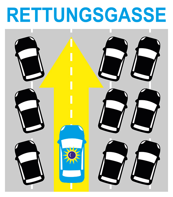 - Die Rettungsgasse so lange offenhalten, bis der Verkehr wieder rollt.