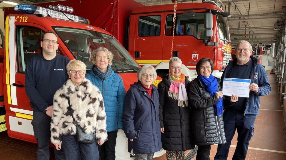 Die Kreativgruppe des Ortsverbandes des Deutschen Evangelischen Frauenbundes stellt über das Jahr praktische und dekorative Handarbeiten her, die dann unter anderem in der Ehrenamtsbude des Reiterlesmarktes an vier Tagen verkauft werden. Das kam jetzt unserer Feuerwehr zugute. Denn für das Jahr 2025 wurde entschieden, dass der Erlös an die Freiwillige Feuerwehr der Stadt Rothenburg o.d.T gespendet wird. Vereinsvorstand Rainer Moll und Stadtbrandinspektor Manuel Gerich freuten sich sehr über die Spende und führten die Überbringerinnen durch die Feuerwache. Von dem Geld soll ein Spannungswarner angeschafft werden. Durch Starkregen laufen des Öfteren Keller mit Elektroinstallationen voll, wodurch Dank des Spannungswarner’s eine tödliche Gefahr für die Einsatzkräfte ausgeschlossen werden kann. (Foto: Deutscher evangelischer Frauenbund)