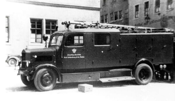 (später Löschgruppenfahrzeug 15) Fahrgestell Daimler Benz Typ L3000F, Aufbau ebenfalls Daimler Benz, Baujahr 1942, eingebaute Feuerlöschkreiselpumpe mit 1500 Liter / Minute Leistung, 400 Liter Wassertank. Kaufpreis 22.000 Reichsmark. Die Feuerwehr Rothenburg war mit diesem Fahrzeug am 21.02.1945 nach den schweren Luftangriffen in Nürnberg im Einsatz. Beim Auftanken wurde das Fahrzeug durch einen Tieffliegerangriff beschossen und total beschädigt. Die Mannschaft blieb glücklicherweise unversehrt.