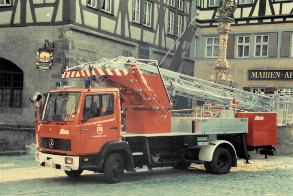 Fahrgestell Daimler Benz, Aufbau Metz Karlsruhe; 18m Leiterlänge (DLK16/4 später 12/9 SE) Diese Drehleiter wurde damals neu beschafft und war von 1989-1999 bei uns im Dienst. Baujahr 1989, Fahrzeug wurde nach der Beschaffung einer neuen 30 m Drehleiter im Jahr 1999 an die Freiwillige Feuerwehr Miltenberg am Main verkauft.