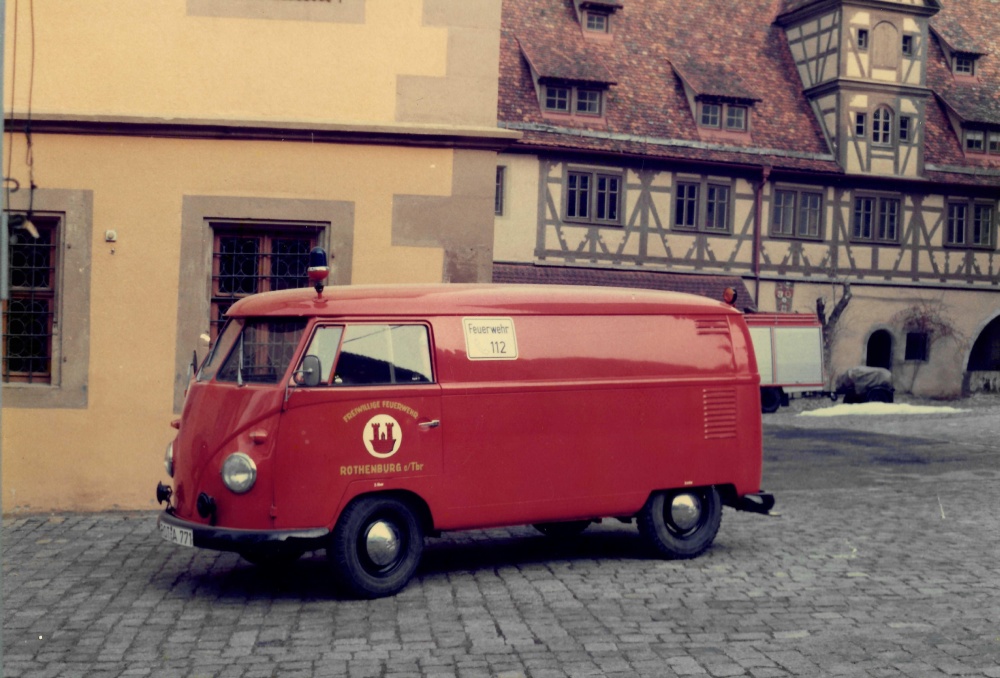Fahrgestell Volkswagen VW Bus Typ 1. Baujahr 1958. Fahrzeug gehörte ursprünglich der Firma Bohne Hemdenfabrik Rothenburg. Es wurde 1965 von der Feuerwehr Rothenburg übernommen und durch Magirus/Ulm ein Feuerwehrtechnischer Umbau ausgeführt. Ausgemustert 1988 und an einen Privatmann aus dem Lkr. Mayen-Koblenz verkauft. Funkrufname Tauber bzw. Florian Rothenburg 5 ab Dezember 1974 Florian Rothenburg 44/1