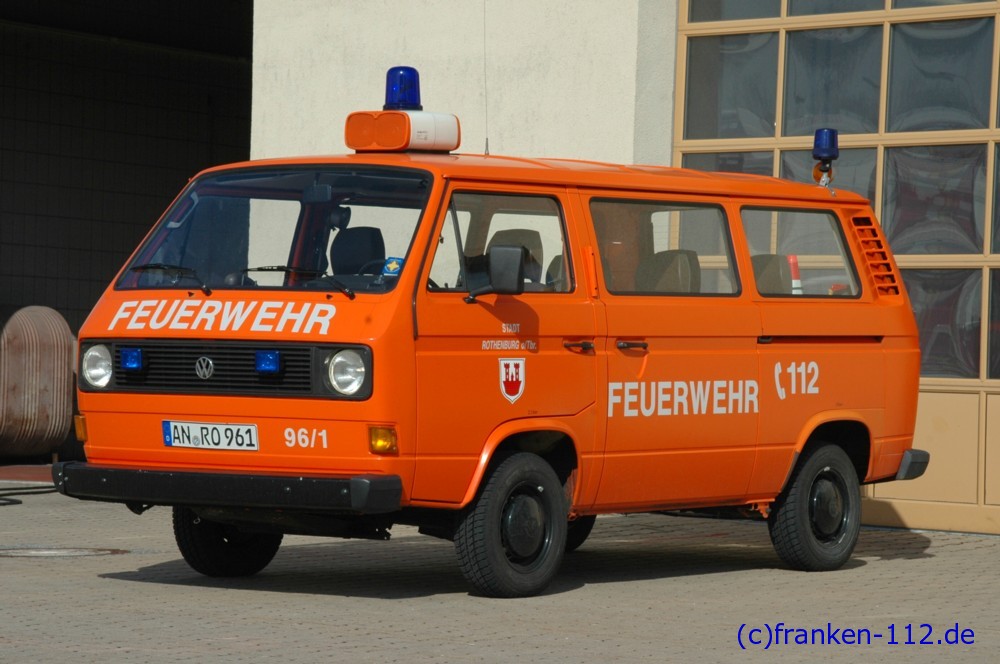 Fabrikat Volkswagen VW Bus Typ 1. Gehörte zuerst dem BRK Rothenburg als Krankenwagen und wurde zuletzt als Krankenwagen in Schillingsfürst eingesetzt. Er wurde 1965 zu einem Feuerwehrfahrzeug durch die Feuerwehr Rothenburg umgebaut. Ausgemustert 1980 und verschrottet. Der Funkrufname lautete Tauber, bzw. Florian Rothenburg 1 ab Dezember 1974 dann Florian Rothenburg 12/1.