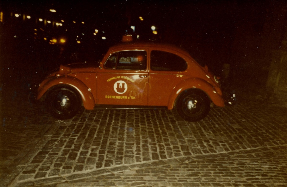 Fabrikat Volkswagen VW Käfer Baujahr 1968; Gehörte zuerst der Landpolizei (grüne Lackierung) als Streifenwagen. Ab 1972 (rote Lackierung) zur Feuerwehr Rothenburg Ausgemustert 1985 verkauft an eine ortsansässige Firma in Rothenburg. Der Funkrufname lautete Tauber, bzw. Florian Rothenburg 11 ab Dezember 1974 dann Florian Rothenburg 11/1.