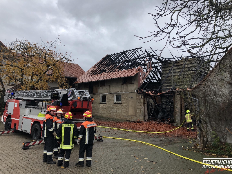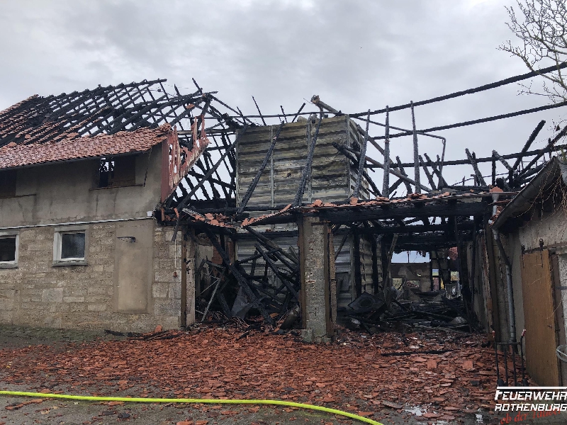 Am Dienstagvormittag wurde die Feuerwehr Rothenburg gemeinsam mit weiteren Feuerwehren in den Rothenburger Ortsteil Hemmendorf zu einem Brand eines landwirtschaftlichen Anwesens alarmiert. Vor Ort standen bei Ankunft bereits zwei Scheunen bzw. Stallungen im Vollbrand, die ersten Maßnahmen zielten daher darauf ab das Wohnhaus mit einer Riegelstellung vor den Flammen zu schützen (was auch gelang). Anschließend wurde sich, mit inzwischen weiterer alarmierter Unterstützung, auf die Brandbekämpfung konzentriert. Hierzu musste eine ca. zwei Kilometer lange Schlauchleitung zum Weiher im Steinbruch von Vorbach gelegt werden, da die in Hemmendorf vorhandenen Löschwassermengen nicht ausreichten. Mit Hilfe dieses Wassers gelang es das Feuer soweit einzudämmen, dass davon keine Gefahr mehr für angrenzende Gebäude ausging. Die betroffenen Gebäude waren nicht mehr zu retten und branden komplett aus. Nach über vier Stunden konnte der Einsatz vor Ort langsam beendet werden und es begann das große Aufräumen und wieder einsatzklar machen der Fahrzeuge. Insgesamt waren über 180 Feuerwehrleute aus Bayern und Baden-Württemberg im Einsatz.
