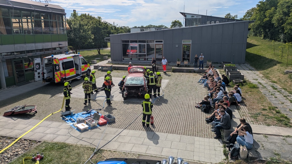 Gemeinsam mit dem Rettungsdienst und der Polizei hat die Feuerwehr Rothenburg am Nachmittag des 20.05.2025 für Schülerinnen und Schüler des Reichsstadt-Gymnasium Rothenburg eine Vorführung im Rahmen der Aktion Discofieber" abgehalten. Es wurde eine Rettung von einer Verletzten bzw. eingeklemmten Person aus einem verunfallten PKW in möglichst realistischem Ablauf und engem Zusammenspiel zwischen den Rettungsdienst- und Feuerwehrkräften gezeigt. Das Bayerische Rote Kreuz und die Feuerwehr Rothenburg haben den zuschauendenden Schulklassen die Patientenbetreuung und -versorgung, sowie die technische Rettung mit schwerem hydraulischem Gerät näher gebracht. Um an die eingeklemmte Person zu erlangen, wurde das Dach des PKWs abgeschnitten und die beiden Türen entfernt. Ziel der Präventionsveranstaltung „Discofieber“ ist es sogenannte Discofahrten zu vermeiden. Vor allem junge Autofahrer/innen tendieren dazu nach dem Feiern alkoholisiert oder unter Drogeneinfluss nach Hause zu fahren. Dies verleitet dazu übermäßig schnell und unvorsichtig zu fahren, die Nachstellung eines schweren Verkehrsunfalles soll den Schüler/innen die möglichen Folgen einer solchen Discofahrt vor Augen führen. Wir bedanken uns für die Zusammenarbeit der unterschiedlichen Organisationen und freuen uns das wir dieses wichtige Projekt am Aktionstag unterstützen konnten. Das Interesse der anwesenden Schülerinnen und Schüler an den technischen Gerätschaften sowie Gesprächen zwischen Schülerinnen und Schülern und den anwesenden Einsatzkräften im Nachgang der Veranstaltung rundeten den Aktionstag ab.